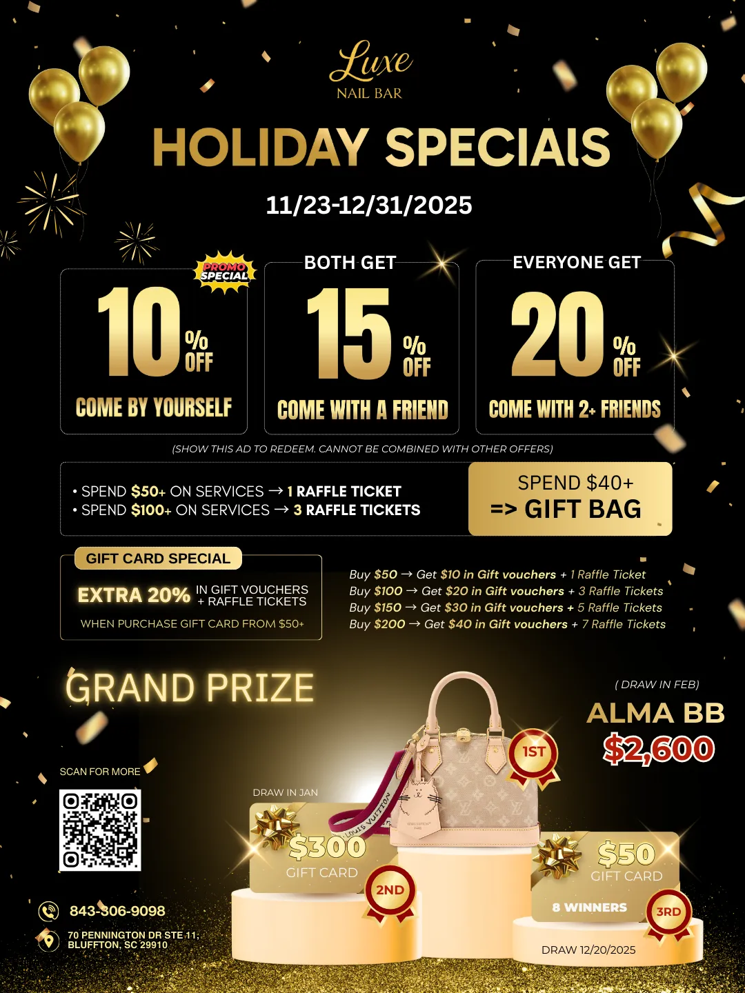 This is the form for you to fill out to receive our Holiday Specials. After filling out we will redirect you to our online booking page. Please book an appointment from there. We might need to call to confirm. Valid only for appointments from 11/23 β 12/31/2025.